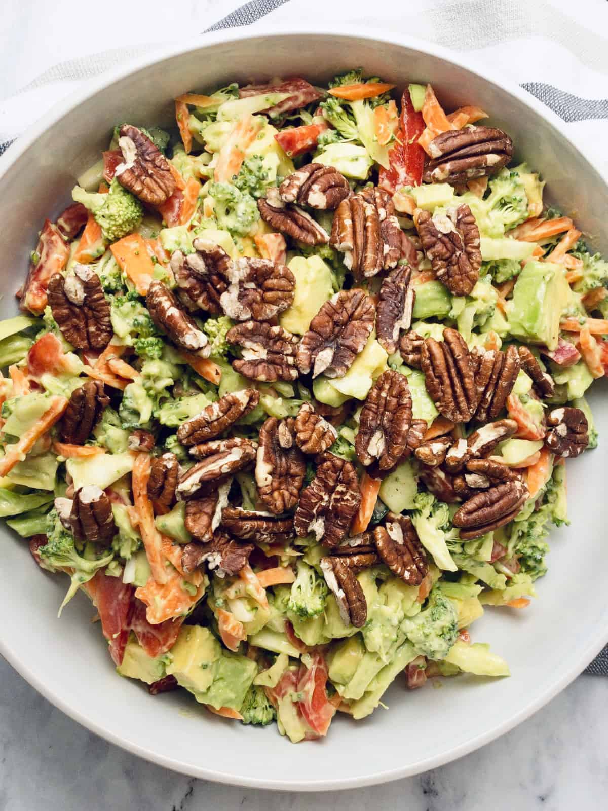 - Alternatively, if you are short on time you can easily just buy a pack of bagged broccoli slaw mix and just add the avocado mayo and nuts for a super-fast salad for dinner.