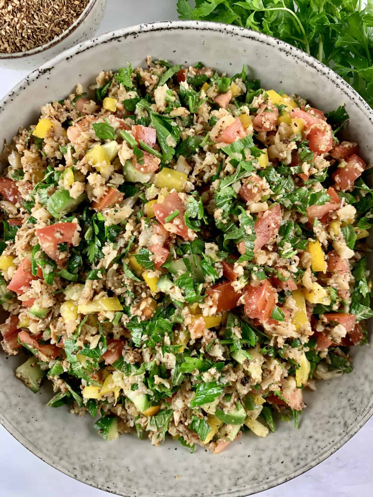 Cauliflower Tabbouleh makes a great gluten-free and low-carb alternative to the traditional Middle Eastern classic. We have sautéed riced cauliflower for extra nuttiness and added Za’atar for extra delicious flavour.