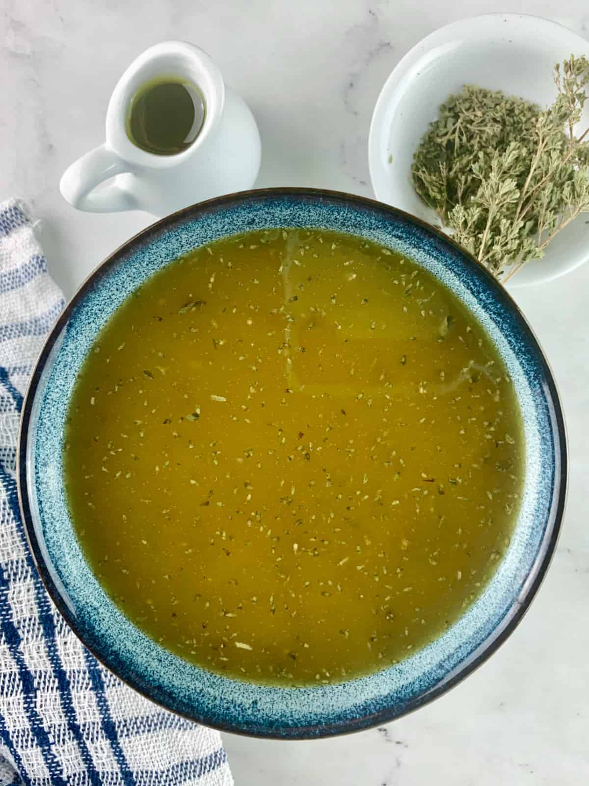 Oregano vinaigrette in a small blue ceramic bowl with dried oregano, sprigs and a small olive oil jug on the side.