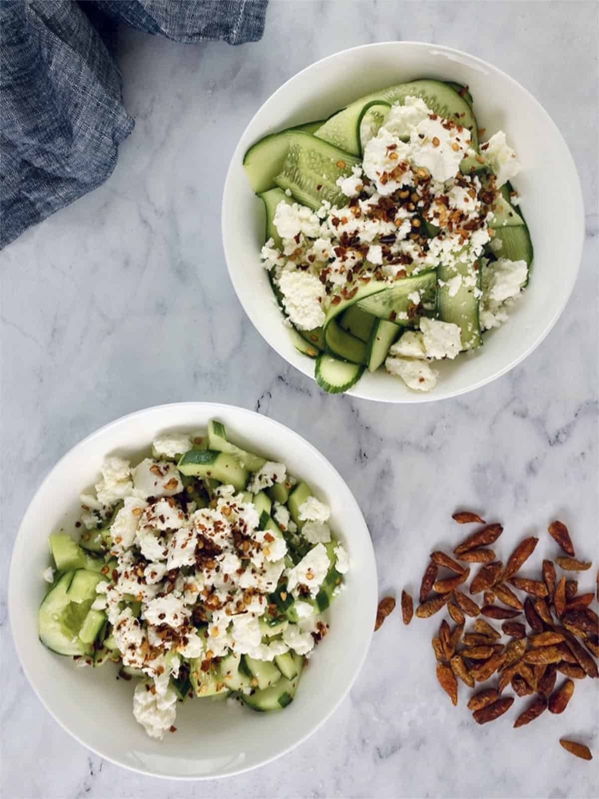 You can make this Feta Cucumber Salad two ways either in curls or half-moons. The curls are prettier while the half-moons are better if you like more feta on your fork.