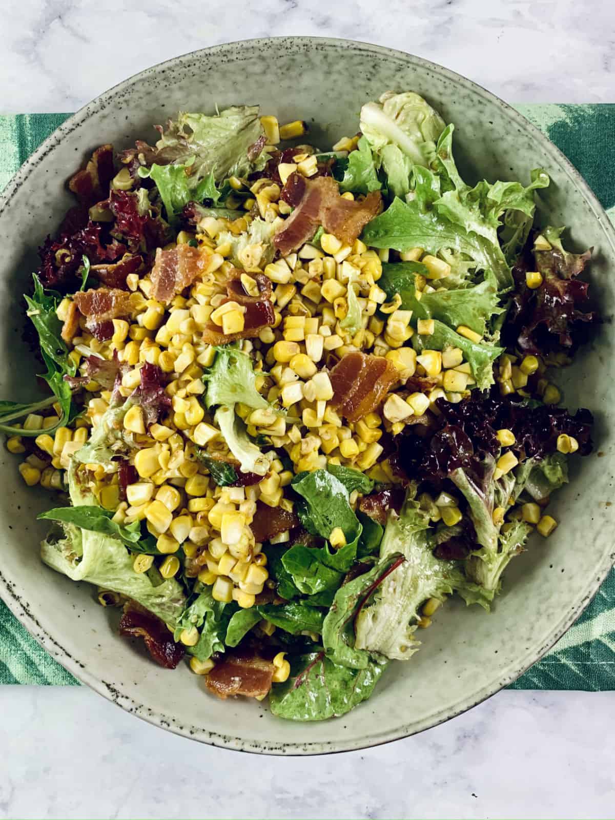 - Place the mixed leaves, grilled corn, and bacon in a large mixing bowl, add the vinaigrette. Season with salt and pepper and toss gently until salad is evenly coated, taste and adjust seasonings to suit your taste.