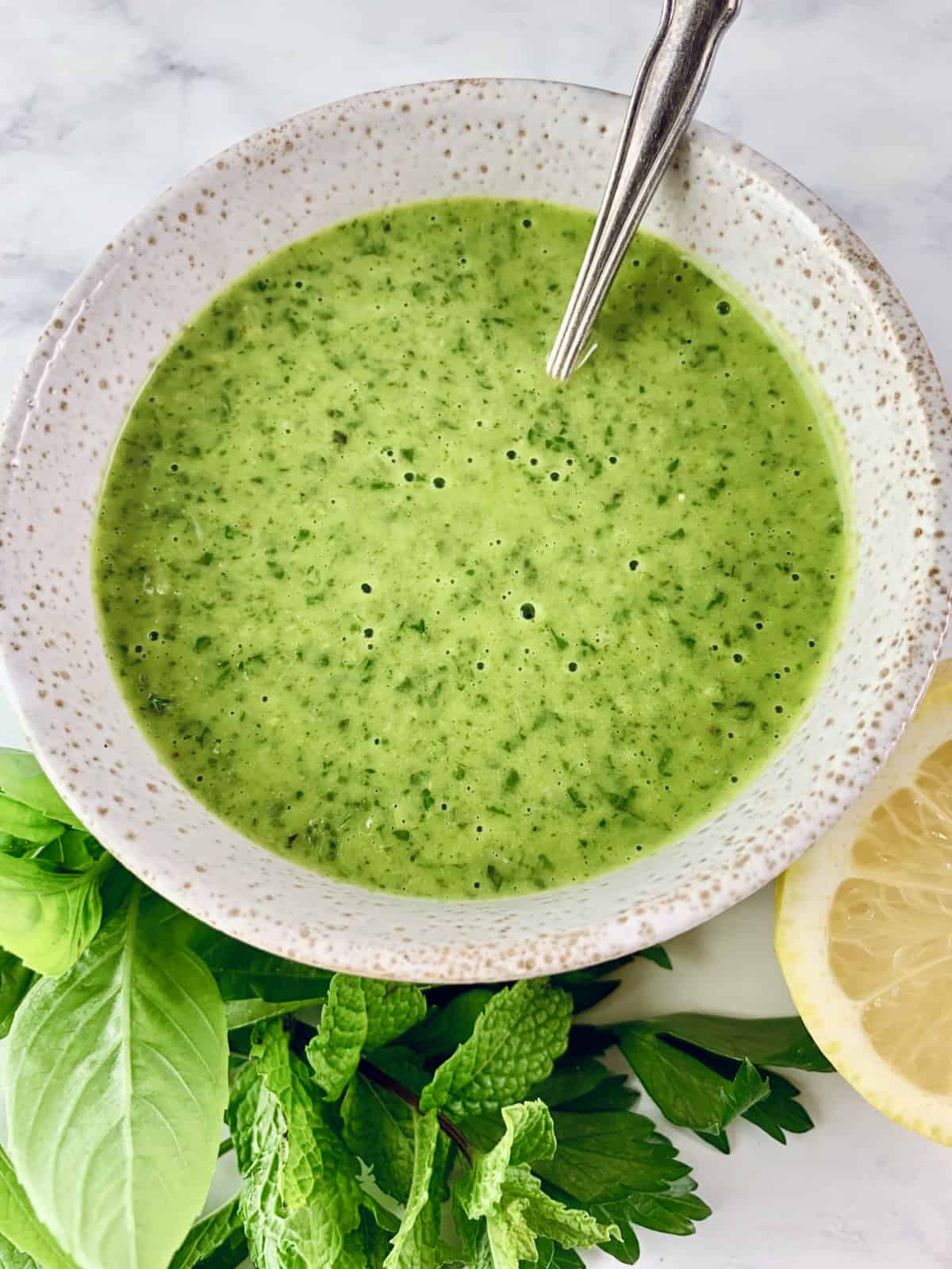 Herby lemon dressing in a bowl with lemon half and herb sprigs on the side.