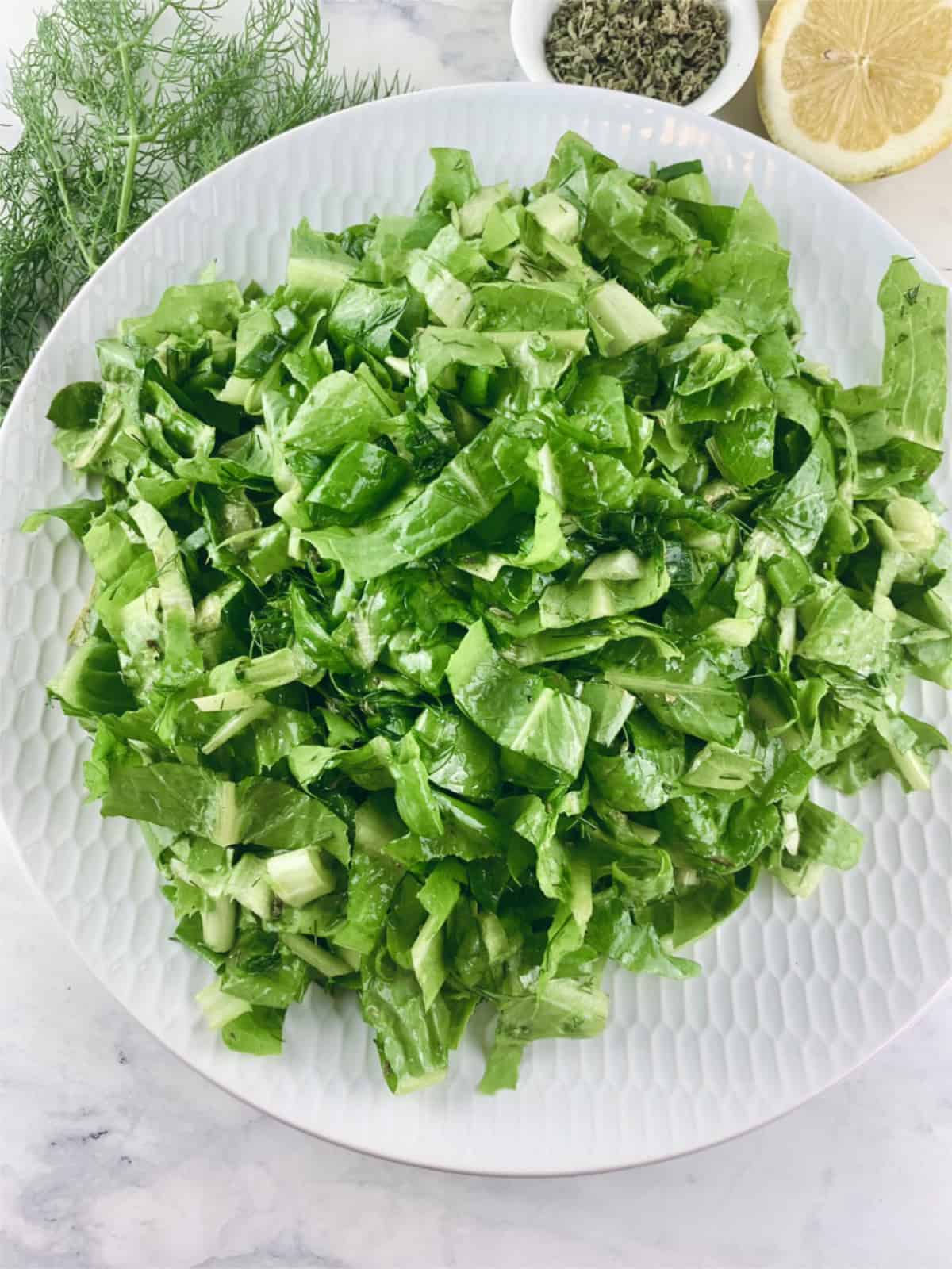 Traditionally this salad is made with crisp, thinly shredded lettuce, green onions and dill with a simple lemon and olive oil vinaigrette. But there are also versions that may include cucumber, feta and olives.