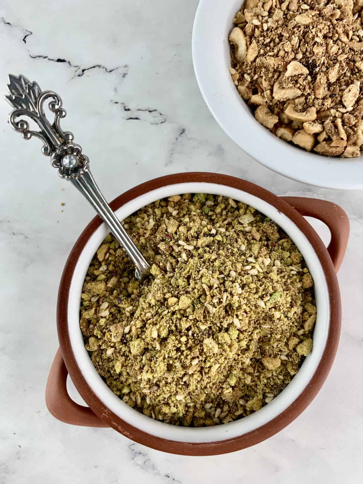 Mixing pistachio dukkah ingredients in a white bowl.