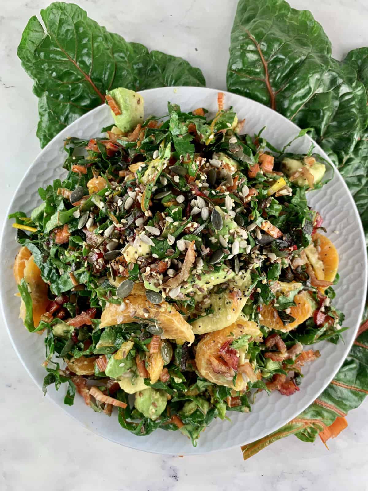 This Chard Salad provides a fresh and delicious combination of crunchy chard, creamy avocado, sweet mandarins, and a zesty mandarin lime vinaigrette. The accompanying seeds add a delightful crunch. As an excellent alternative to coleslaw, it is sure to be a hit with all who try it.