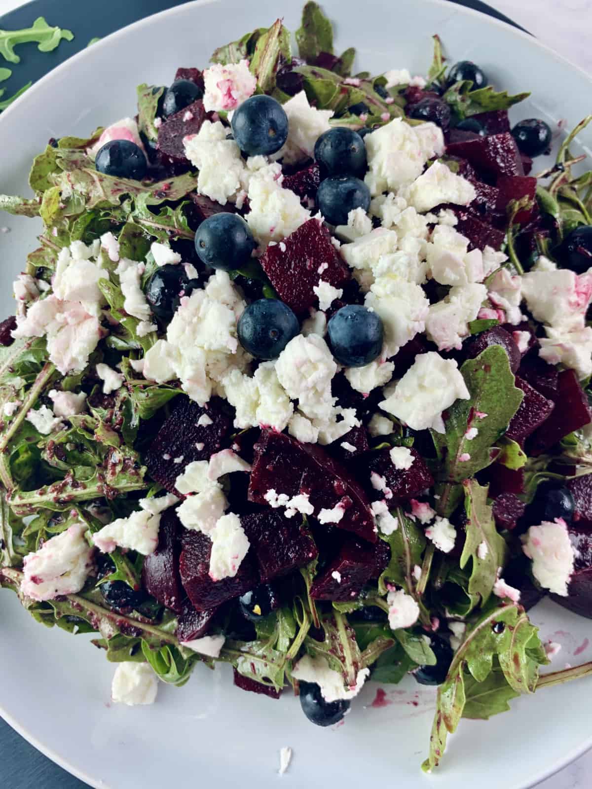 - Place your diced beets, rocket and blueberries in a large mixing bowl, season with salt and pepper, pour over the dressing, toss until everything is well coated.