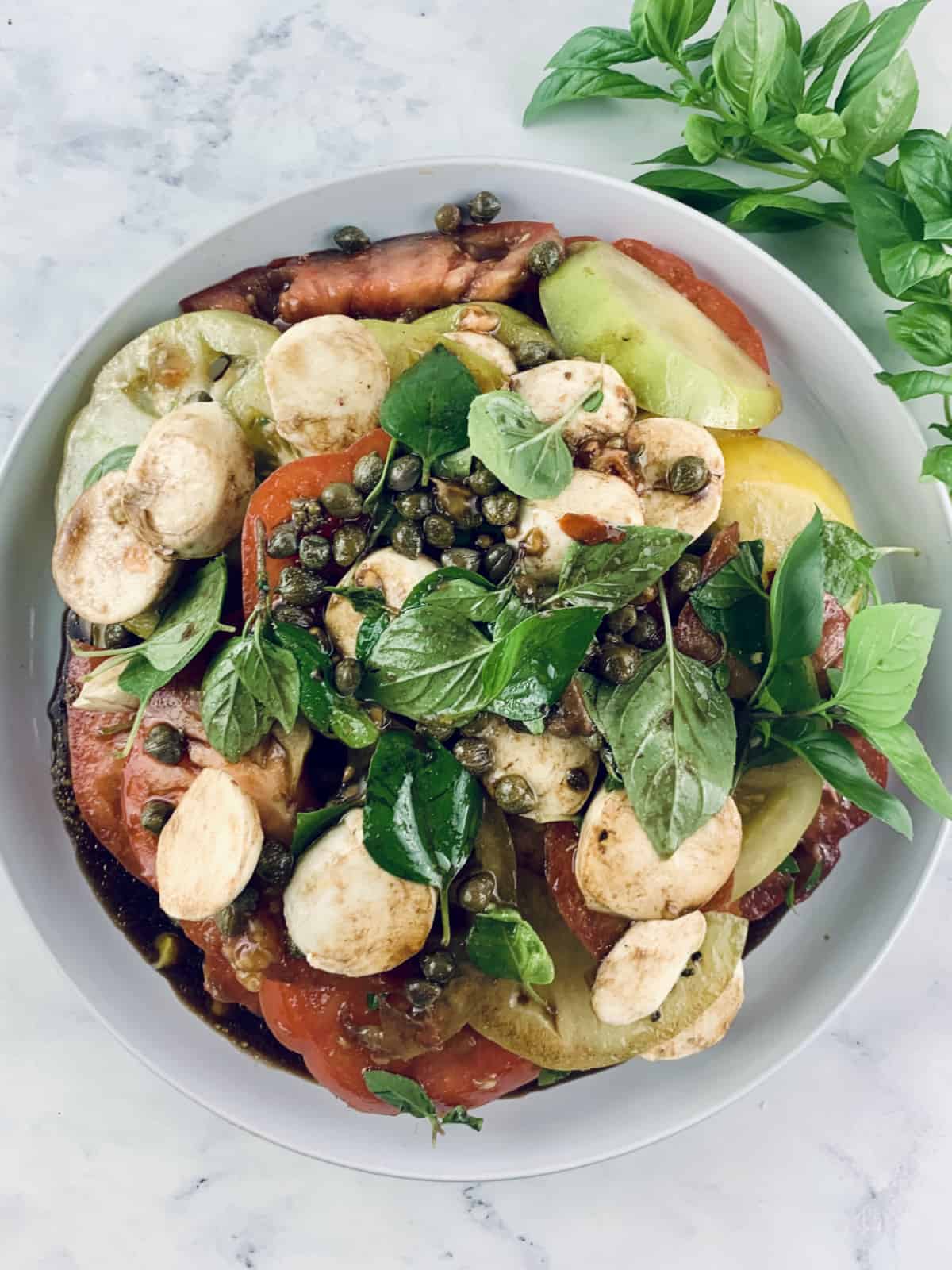 This Tomato Bocconcini Salad will soon become a summer favourite! So quick and easy to prepare and loaded with sweet aromatic summer tomatoes and creamy slices of soft cheese.