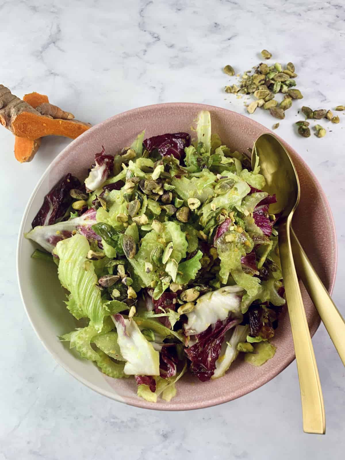 The pungent turmeric and spicy ginger dressing complement the crunchy celery, earthy pistachios and sweet Medjool dates while crisp salad leaves add the perfect base for this salad.