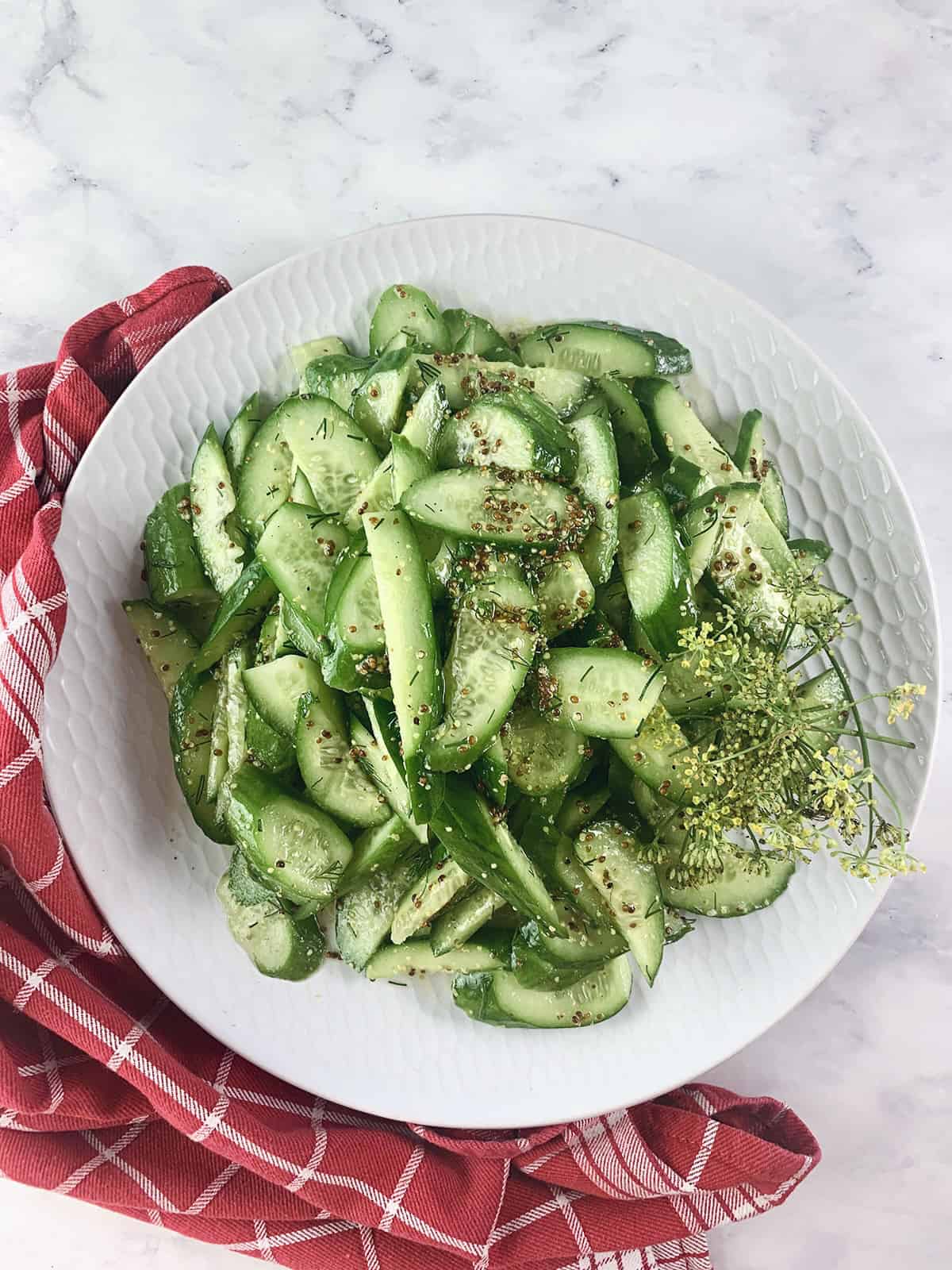 This cucumber salad is the ideal side for BBQs it is quick and easy to make and is happy chilling in the fridge until you are ready to serve.