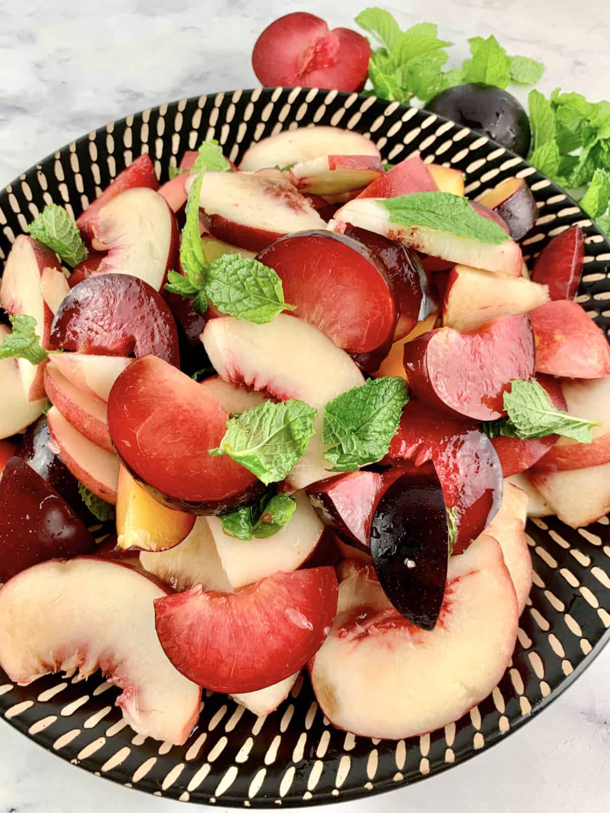 Try our delectable White Peach Salad made with fresh white peaches and juicy plums. All tossed with honey, lime juice and fragrant mint it makes a fresh summer side dish that’s perfect for BBQs and parties!